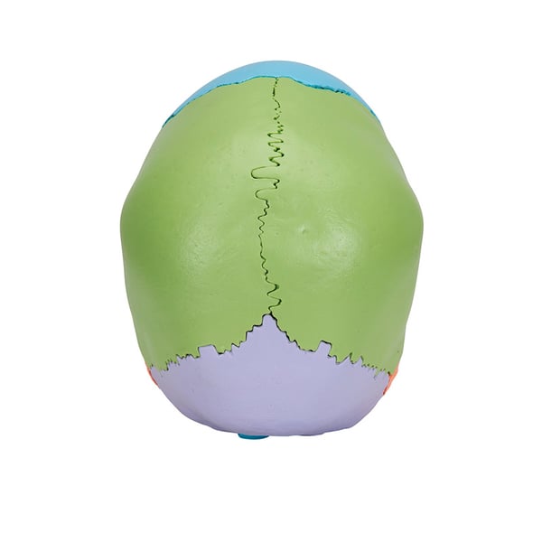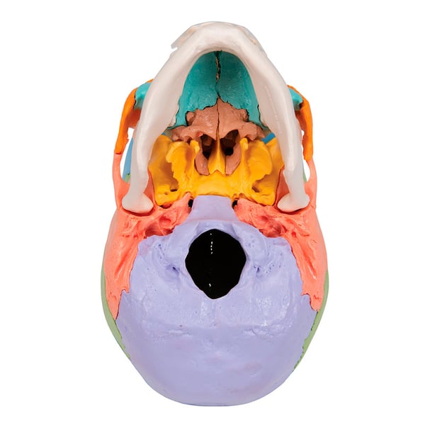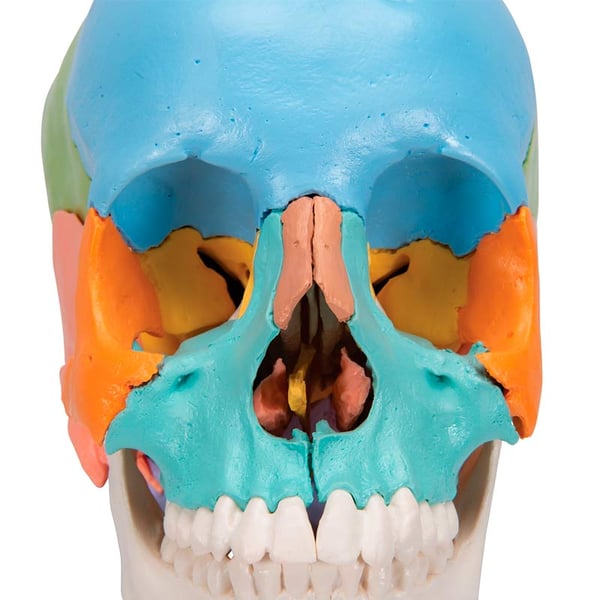 - Die Knochen werden in 9 verschiedenen Farben dargestellt, um die Identifizierung jedes Teils des Schädels zu erleichtern. Knochenplattenpaare haben die gleiche Farbe.