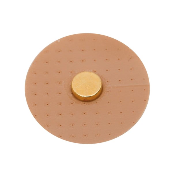 Vergoldete Magnete (6.000 Gaus) auf beigem Kleber. Flache zylindrische Form. In Richtung des Körpers ist der Südpol.