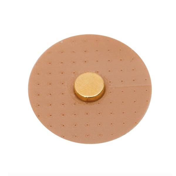 Vergoldete Magnete (9.000 Gaus) auf beigem Kleber. Flache zylindrische Form. In Richtung des Körpers ist der Südpol.