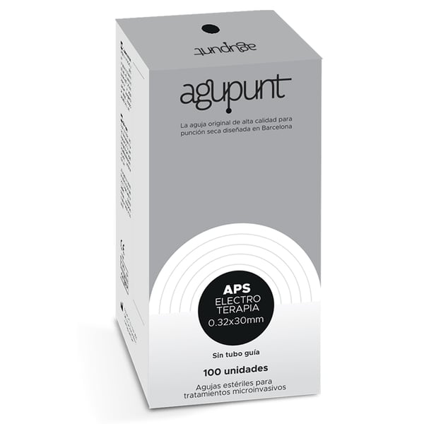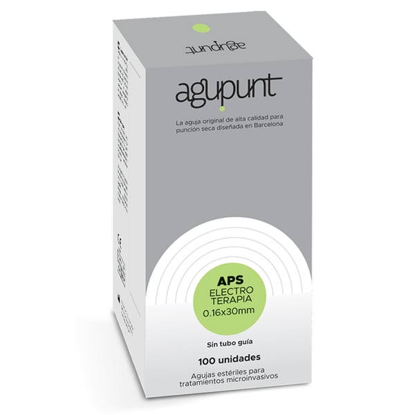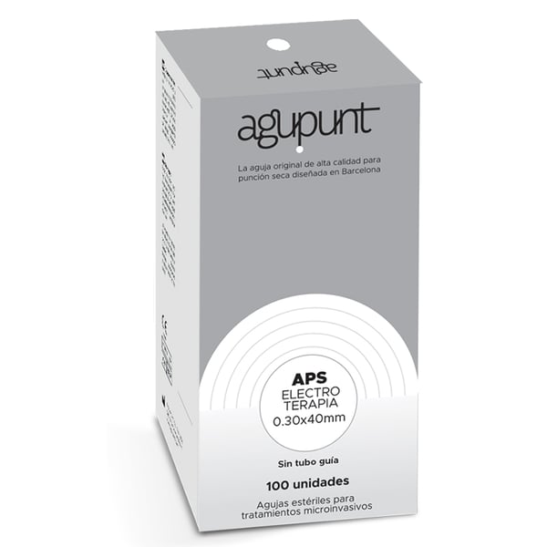 Agupunt Elektrotherapienadeln ohne Führungsrohr . Nadeln, die speziell für Elektrotherapie-Behandlungen, einschließlich der Elektrolysetechnik, entwickelt wurden . Es hat eine größere Leitfähigkeit der Nadel und erleichtert den Durchgang von Elektronen zur Grenzfläche zwischen Nadel und degeneriertem Gewebe. Dadurch kann die Wirkung ausschließlich auf das degenerierte Gewebe ausgeübt werden, ohne dass es zu Wechselwirkungen mit dem angrenzenden gesunden Gewebe kommt. Es bietet eine bessere Visualisierung unter Ultraschallkontrolle und garantiert eine korrekte Anwendung der Technik im Fokus der Läsion. Ebenso weist es eine höhere Elektronenkonzentration an der Nadelspitze auf, was ein intensiveres elektrisches Feld und damit eine größere elektrochemische Wirkung bei geringerer Dosis im verletzten Gewebe gewährleistet. Darüber hinaus dringt es besser und schmerzärmer in das Hautgewebe ein .
