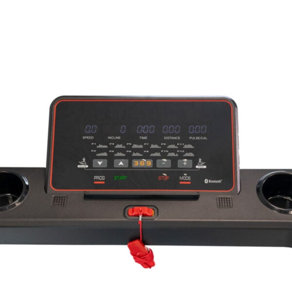 - Enthält 12 Programme und ein LED-Display mit Anzeigen für Geschwindigkeit, Steigung, Zeit, Distanz, Kalorienverbrauch und Puls.