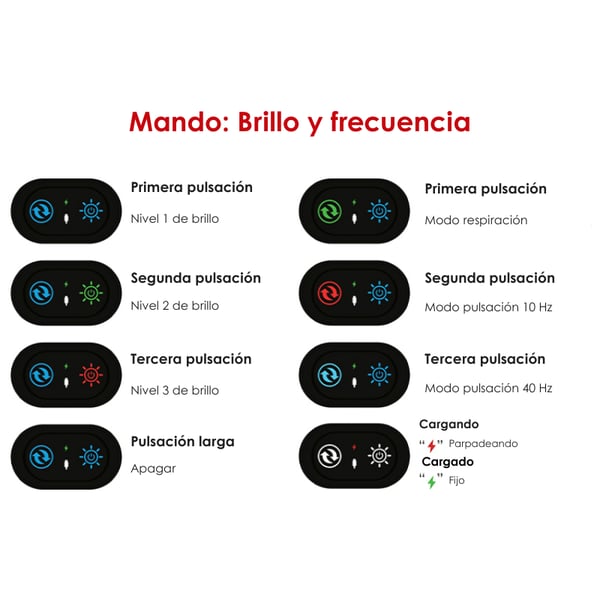 - Steuerung per Knopfdruck mit Pulsmodi und Helligkeitsoptionen (einschließlich 10 Hz und 40 Hz bei den aufgerüsteten Modellen), um die Therapie an Ihren Komfort anzupassen.