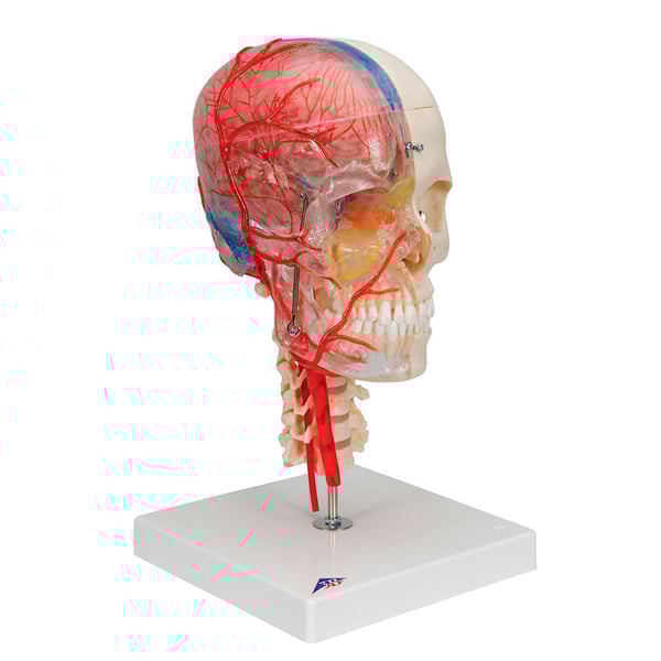 Das neue Deluxe Bonelike Didaktik-Schädelmodell klärt alle anatomischen Zweifel. Es gibt die Möglichkeit , Strukturen in der transparenten Hälfte des Schädels und die Knochen in der knöchernen Hälfte zu erkennen.