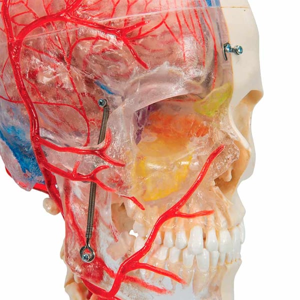 - Die Möglichkeit, die Strukturen in der transparenten Schädelhälfte und die Knochen in der knöchernen Hälfte zu kennen, macht diesen Schädel von großem didaktischem Interesse.