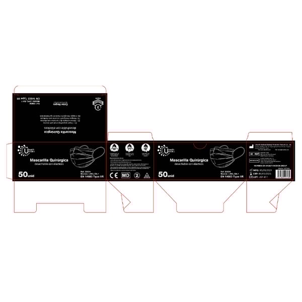 Die chirurgische Maske vom Typ IIR wurde aus drei Schichten Vliesstoff und Filtergewebe hergestellt, sie hat einen formbaren Nasenstreifen aus Stahl + PP und zwei weiche Gummibänder zur Anpassung.