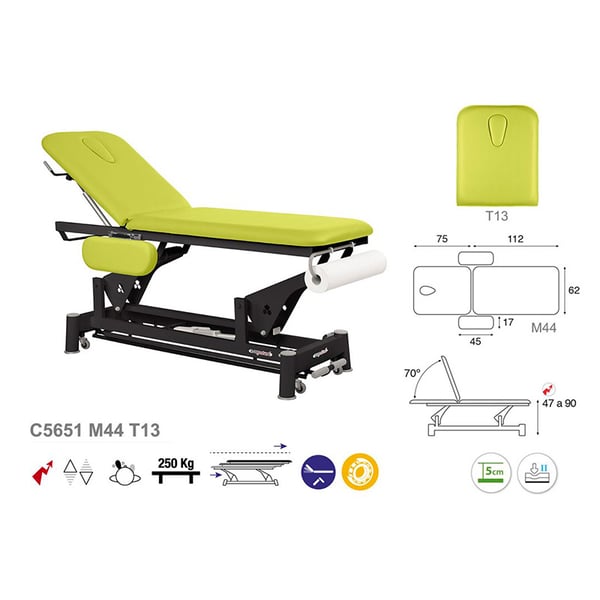 Ecopostural elektrische Trage: zwei Körper mit schwarzer Verbindungsstangenstruktur, klappbaren Armen und T13-Kopfstütze (62 x 188 cm)