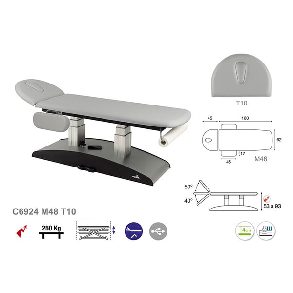 Elektrische Trage mit zwei Säulen, zwei Körpern und vertikaler Erhöhung mit Gesichtsloch und halbrundem Kopfteil. Es hat ein einfaches, modernes und funktionales Design. Ein weiterer großer Vorteil des Tisches ist seine Vielseitigkeit, da er sich ideal für zahlreiche Bereiche eignet: Physiotherapie, Osteopathie, Allgemeinmedizin, Ästhetik, Tätowierungen. Eine perfekte Lösung für jeden Gesundheits- und Ästhetikprofi.