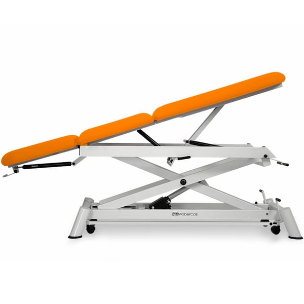 Dreiteilige elektrische Osteopathietrage mit negativ verstellbarer Rückenlehne, Mittelfalte und geradem Anstieg ohne seitliche Bewegung. Inklusive Gesichtskappe und einziehbaren Rädern . Es besteht aus einer Trendelenburg-Position mit zwei Gaskolben.