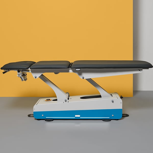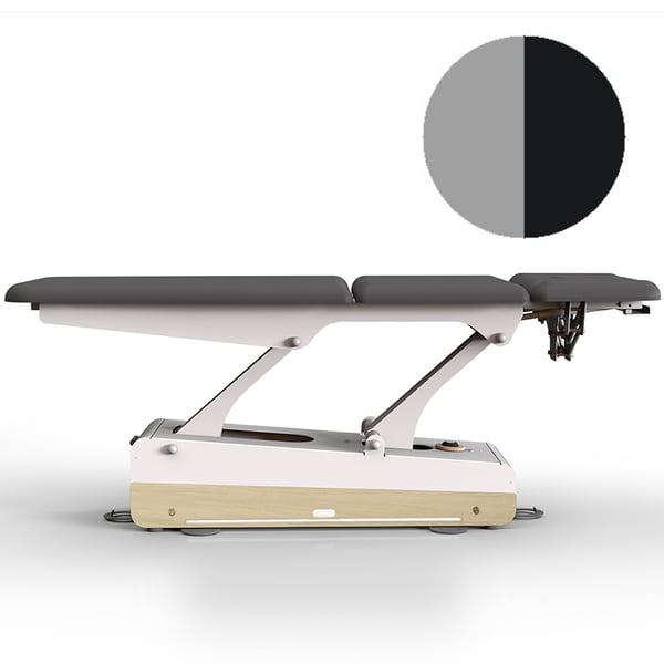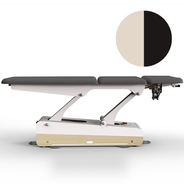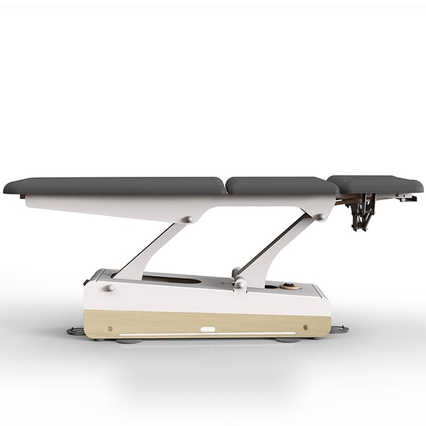 Die Liege verfügt über fünf Abschnitte und einen motorisierten Mittelabschnitt , sodass Behandlungen im Liegen oder in halbliegender Position des Patienten möglich sind. Sie ist mit einer beheizten XL-Matratze , vier um 360 Grad drehbaren Rädern und einem hebelbetätigten Verriegelungs-/Entriegelungssystem für einfaches Bewegen ausgestattet.