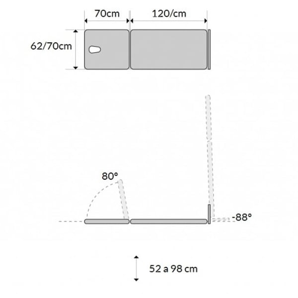 Elektrische Stehliege oder Zweikörper- Schrägliege mit motorischer Höhenverstellung und Vertikalisierung . Es besteht aus unabhängigen und verstellbaren Fußstützen (Neigung/Neigung), einer hochfahrbaren Rückenlehne , Seitenführungen für Befestigungsgurte und einziehbaren Rädern . Es verfügt außerdem über Griffe, Goniometer und Befestigungsgurte .