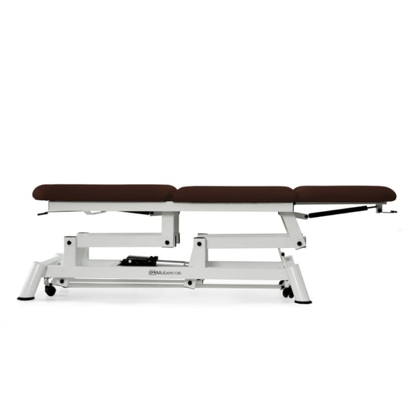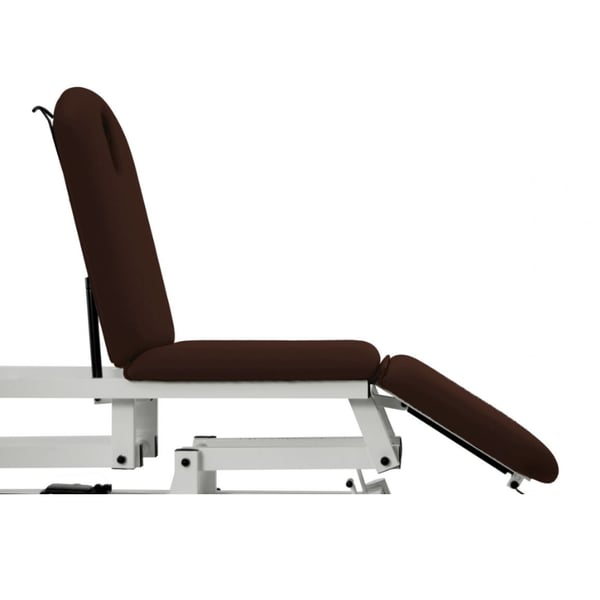 Dreiteilige elektrische Trage, Sesseltyp, mit Toilettenpapierhalter, Gesichtskappe und einziehbaren Rädern . Speziell für Physiotherapie- und Rehabilitationsbehandlungen konzipiert.