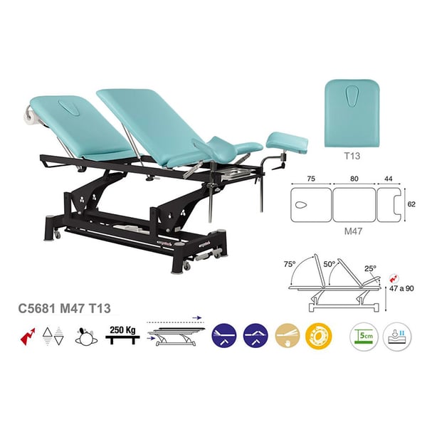 Elektrische Trage, Ecopostural, ideal für Spezialitäten: drei Körper, mit Beinschlaufen, schwarzer Verbindungsstangenstruktur und T13-Kopfstütze (62 x 200 cm)