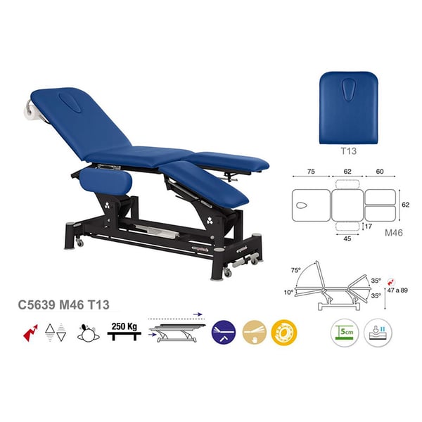 Elektrische Trage, Ecopostural, ideal für Spezialitäten: drei Körper, mit klappbaren Armen, schwarzer Verbindungsstangenstruktur und T13-Kopfstütze (62 x 198 cm)