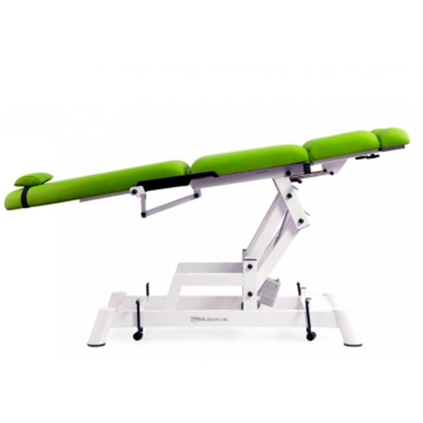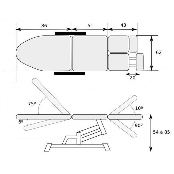 Podologischer elektrischer Stuhl mit drei Körpern . Es besteht aus zwei Motoren zur Höhen- und Rückenlehnenverstellung mit Handbedienung. Umfasst Metall- und gepolsterte Armlehnen , die um 180º angehoben werden können 8), unabhängige und ausziehbare Beinstützen und ein ergonomisches Nackenkissen . Außerdem verfügt es über die kompensierte Trendelenburg-Lage .
