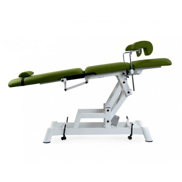 Elektrischer gynäkologischer Untersuchungsstuhl mit drei Körpern. Es besteht aus zwei Motoren zur Höhen- und Rückenlehnenverstellung per Handbedienung. Inklusive gynäkologischer Beinstützen, abnehmbarem Edelstahltablett und ergonomischem Nackenkissen. Außerdem verfügt es über eine kompensierte Trendelenburg-Lage.
