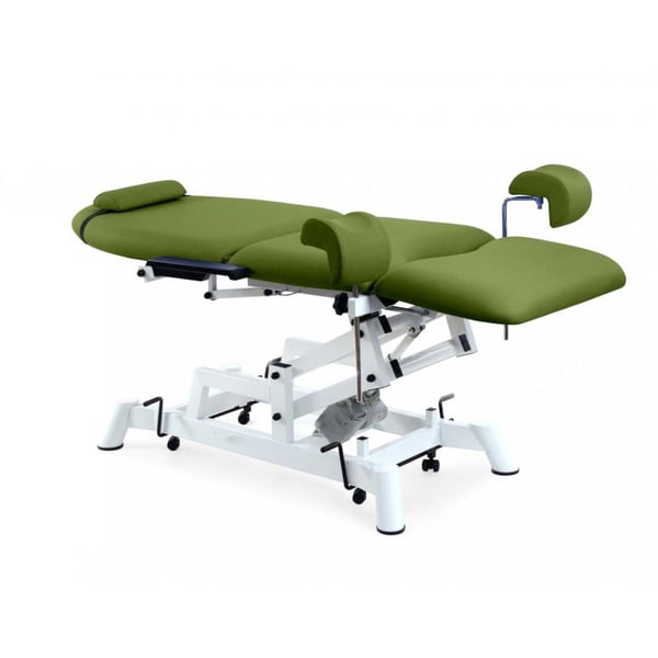 Elektrischer gynäkologischer Untersuchungsstuhl: drei Körper, mit zwei Motoren für Höhen- und Rückenverstellung, gynäkologische Beinstützen, Nackenkissen und kompensierter Trendelenburg
