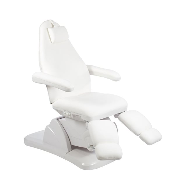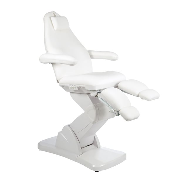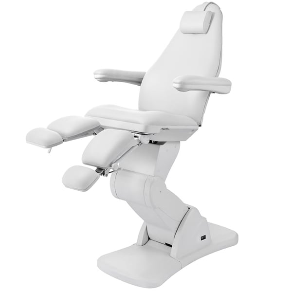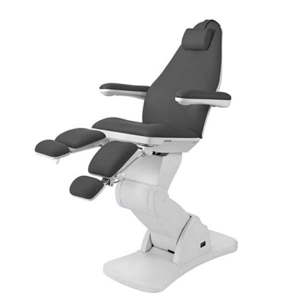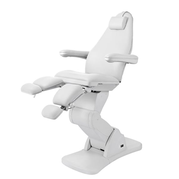 Hochwertiger Podologiestuhl mit sehr stabiler Struktur und drei Motoren zur Steuerung der Höhe, Rückenlehne und Sitzneigung. Es verfügt über klappbare Armlehnen und ein abnehmbares Kopfstützenkissen mit Gesichtsloch, unabhängig voneinander verstellbare Fußstützen mithilfe eines Gaskolbens, der ihre Höhe reguliert, und mit seitlicher Öffnung bis zu 90°.