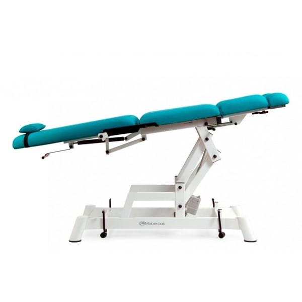 Dreiteiliger elektrischer Podologiestuhl . Höhenverstellbar per Handbedienung. Ausgestattet mit um 90° neigbaren Armlehnen (Metall, gepolstert), unabhängig verstellbaren und ausziehbaren Beinstützen sowie einem ergonomischen Nackenkissen . Zusätzlich mit kompensierter Trendelenburg-Position .