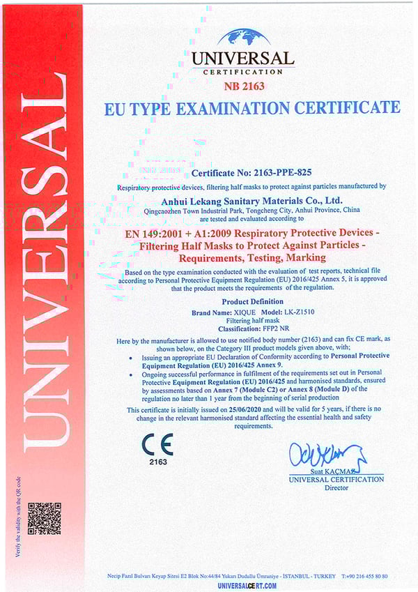 - Getestet und nachgewiesen seine Wirksamkeit in Laboratorien. Diese Konformitätsbescheinigung wurde auf der Grundlage der Ergebnisse von Tests vergeben, die im von CNAS (China National Accreditation Service) akkreditierten Jiangsu-Qualitätsüberwachungs- und Inspektionszentrum für spezielle Sicherheitsschutzprodukte durchgeführt wurden . Die Maske entspricht den Bestimmungen der spezifischen Vorschriften der Europäischen Union und ist nach EN 149: 2001 + A1: 2009 zertifiziert .
