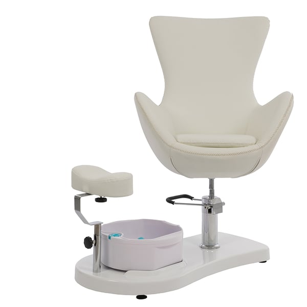 Fußpflegesessel mit höhen- und längenverstellbarer Fußwanne und Fußstütze. Höhe und Drehung des verstellbaren Stuhls mit Hydraulikpumpe und Verriegelungssystem. Weiß gepolstert in PU und pflegeleicht.