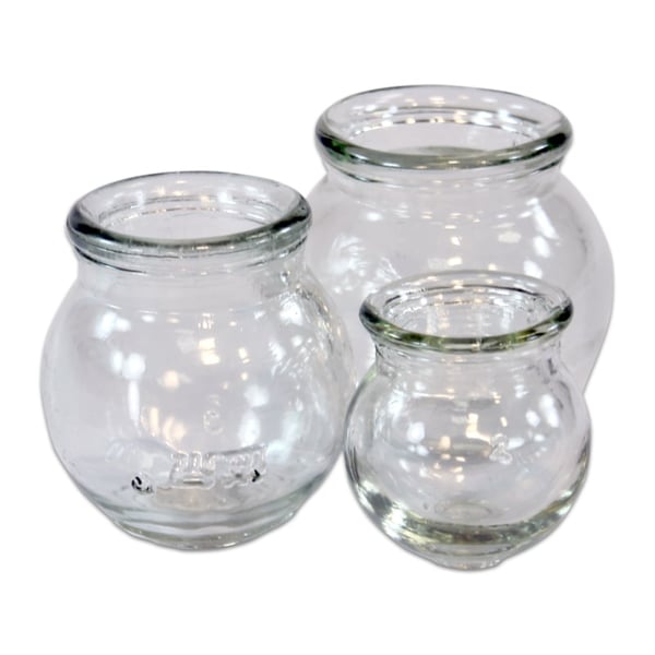 Kit aus Glas-Saugnäpfen mit einem dicken Rand in der Öffnung. Durch die Abflachung am Kopf ist es möglich, den Saugnapf mit der Öffnung nach oben zu platzieren.