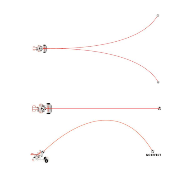 Kurveneffekt : Ein Kurvenstart wird erreicht, indem die beiden Schießräder auf gleicher Höhe gehalten und auf unterschiedliche Geschwindigkeiten eingestellt werden. Der Ball dreht sich um seine vertikale Achse und nimmt eine gekrümmte Bahn.