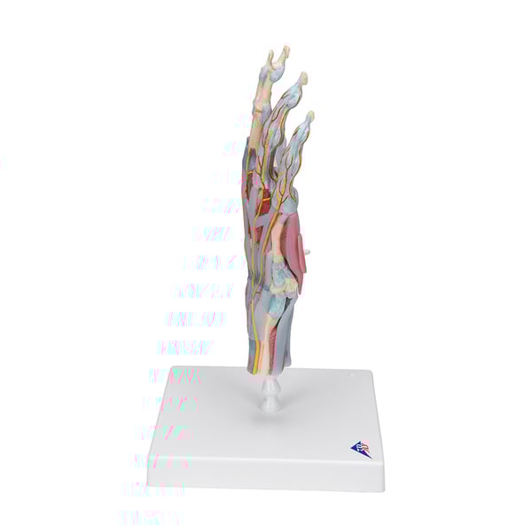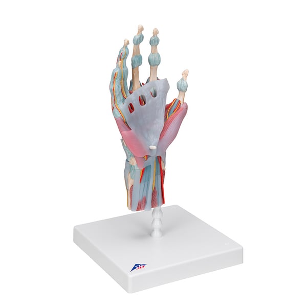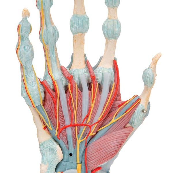 Das Modell des Handskeletts mit Bändern und Muskeln ist hochwertig und besteht aus 4 Teilen. Zeigt alle Knochen, Muskeln, Sehnen, Bänder, Nerven, Arterien und Venen der Hand und des unteren Unterarms.