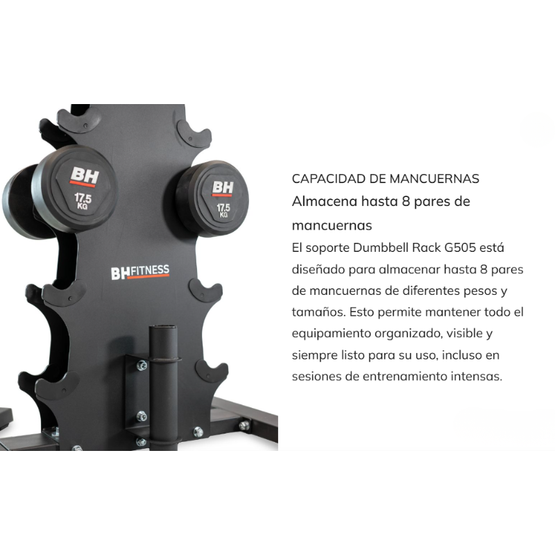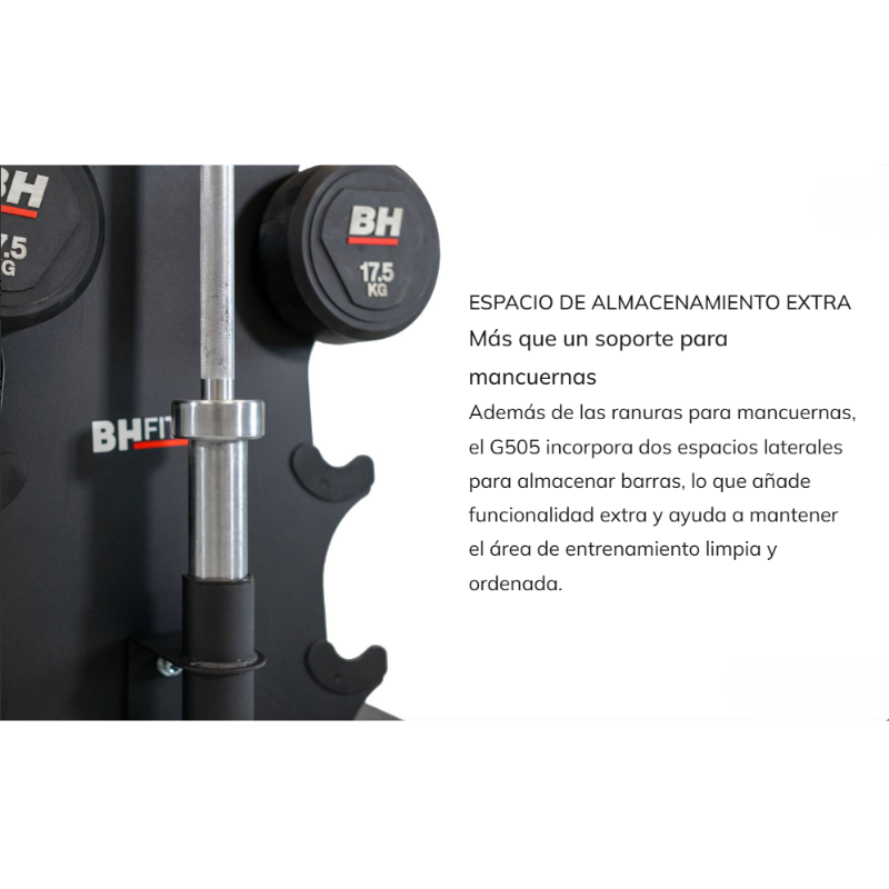 Der BH Fitness G505 Hantelständer dient der übersichtlichen und sicheren Aufbewahrung von Hanteln im Heim-Fitnessstudio. Sein kompaktes Design sorgt für Ordnung im Trainingsbereich und ermöglicht den schnellen Zugriff auf die Hanteln während des Krafttrainings.