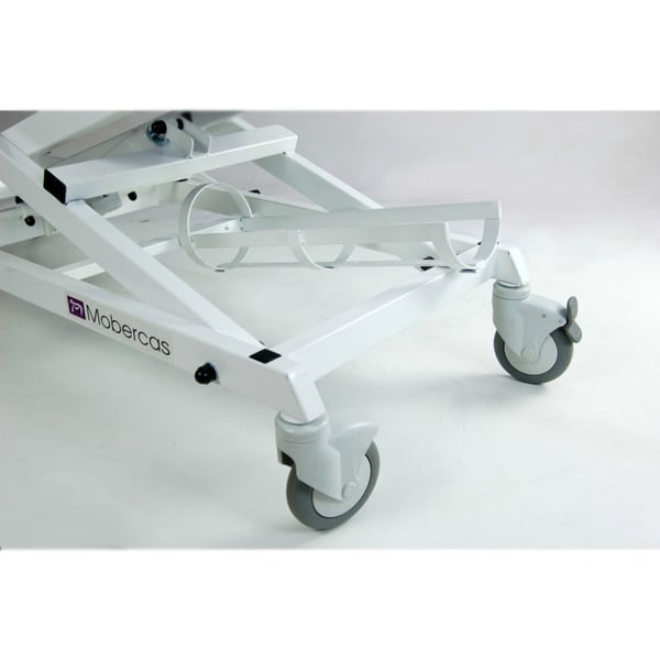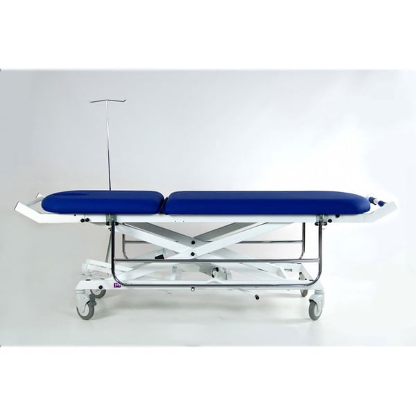 Hydraulischer Transferwagen mit zwei Körpern . Er verfügt über Handläufe, einen Infusionsständer, einen Flaschenhalter, abnehmbare und klappbare Schieber (am Kopf- und Fußende) und 125-mm-Transporträder .