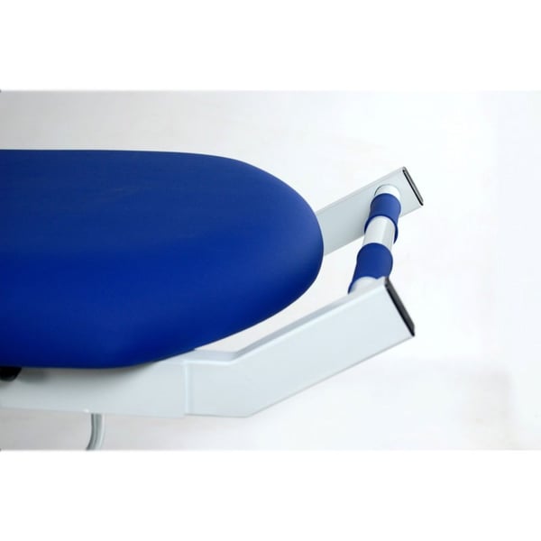 Die Rückenlehne ist per Hebel um 70° verstellbar . Zudem verfügt sie auf beiden Seiten über Klappschienen , um die Position des Patienten zu sichern und ein Herunterfallen während des Transfers zu verhindern.