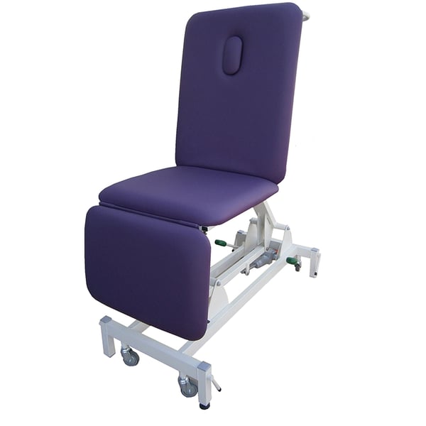 - In der Rückenlehne befindet sich ein Gesichtsloch mit gepolstertem Stopfen, um den Patienten bequem „mit dem Gesicht nach unten“ zu positionieren.