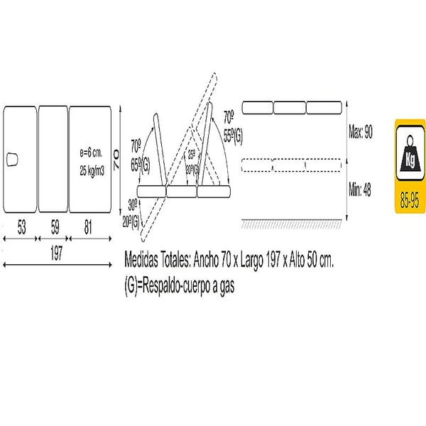 - Maße: 194 cm x 70 cm x (48 - 90 cm).