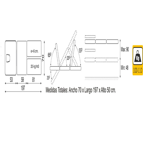 - Maße: 194 cm x 70 cm x (48 - 90 cm).