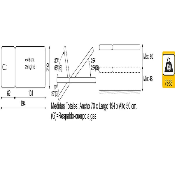- Maße: 194 cm x 70 cm x (48 - 90 cm).
