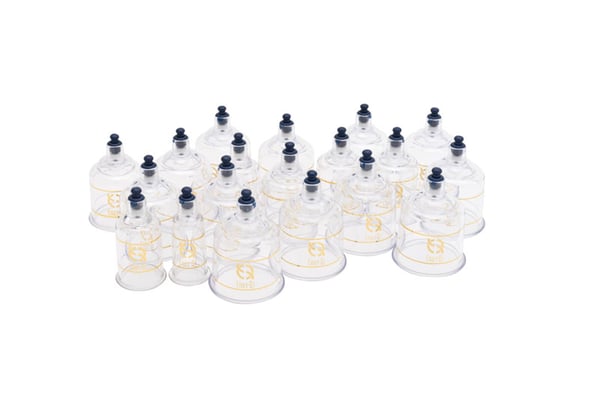Set mit 19 Saugnäpfen, mit Magnetventilen , Pistole und Schlauch zur Selbstanwendung. Es hat 5 Takte . Präsentiert in einem Etui aus Metall und Kunstleder .