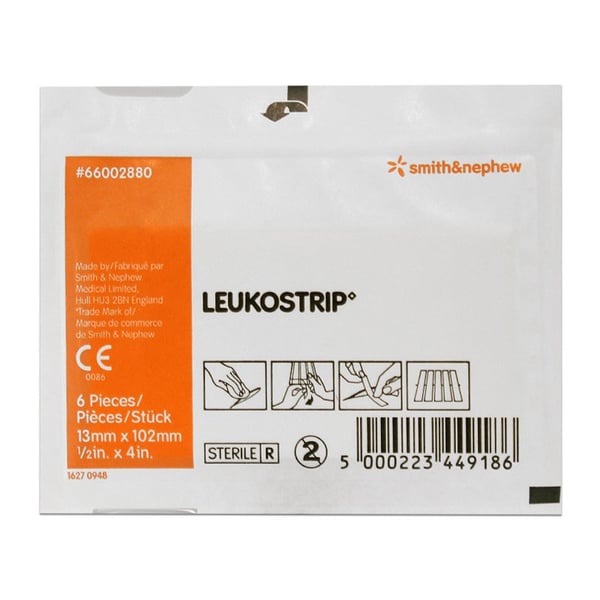 Leukostrip sind poröse Klebestreifen zum Wundverschluss aus 100 % Polyamid, die mit einem hypoallergenen Klebstoff überzogen sind, der den praktisch schmerzfreien Verschluss einer Wunde erleichtert.