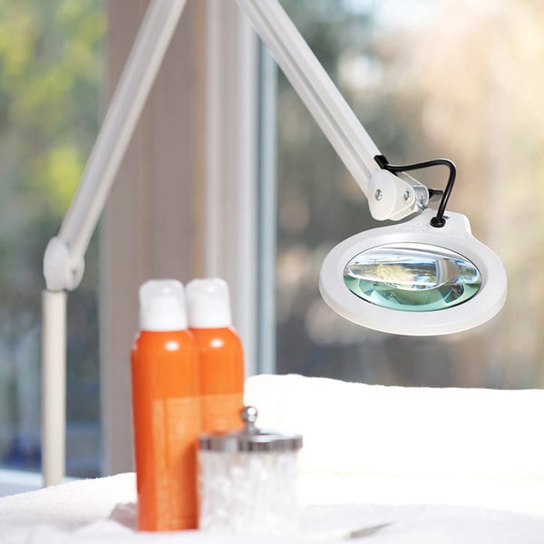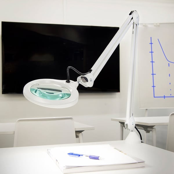 - Schattenlose Vergrößerung: Die Standardversion wird mit einer 3-fach vergrößernden Glaslinse geliefert. Die Glaslinse mit einem Durchmesser von 127 mm ist in der Mitte eines kreisförmigen Moduls aus LED-Lichtquellen platziert. Dies ist die ideale Methode, um ein Objekt zu beleuchten und Schatten praktisch zu eliminieren. Außerdem kann es mit Zusatzlinsen von 4, 6 oder 10 Dioptrien geliefert werden. Zum Schutz des Objektivs wird eine Stoffabdeckung mitgeliefert.