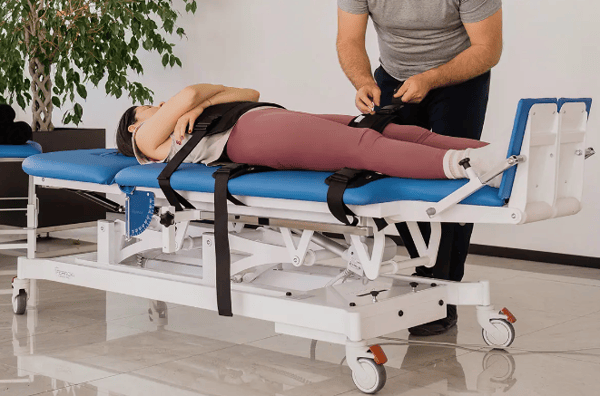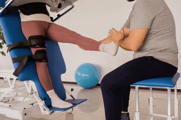 - Die zentrale Führung erleichtert die Befestigung der 5 Sicherheitsgurte an den unteren Extremitäten; sie ermöglicht es auch, eine Extremität für mögliche vom Therapeuten vorgegebene Übungen freizugeben.