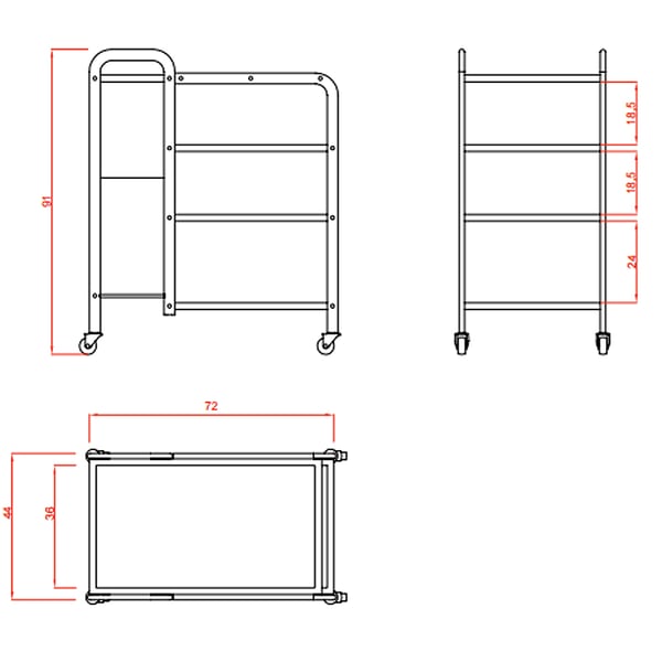 Mobiler Wagen aus weißem Metall: Ausgestattet mit vier durchscheinenden Glasböden und einer Seitentasche