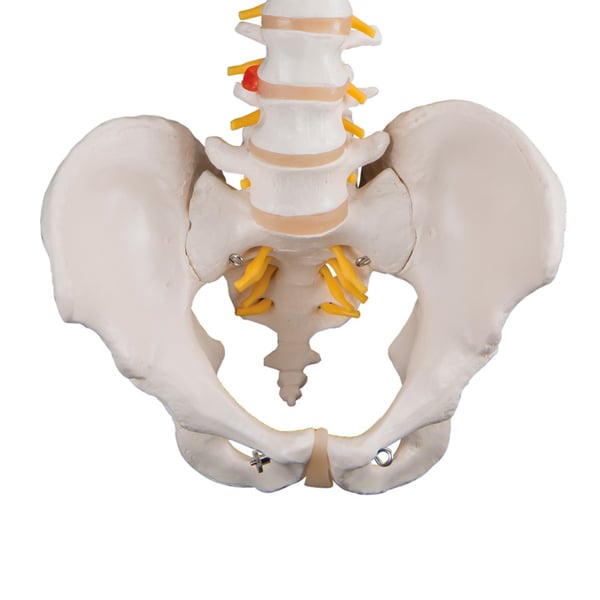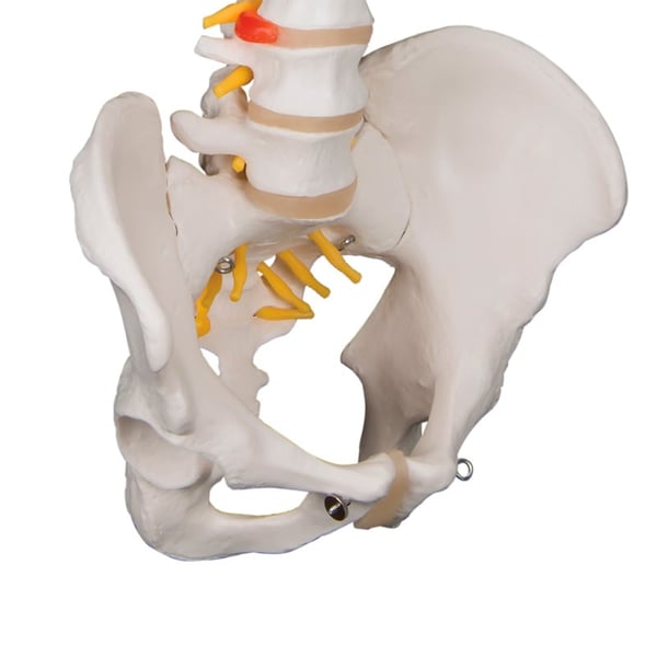 Es verfügt über eine vollständig flexible Halterung für explizite Demonstrationen. Zeigt ein männliches Becken mit Hinterhauptsplatte und einem Bandscheibenvorfall zwischen dem 3. und 4. Lendenwirbel. Außerdem zeigt es den Ausgang von Nervenwurzeln und Wirbelarterien.