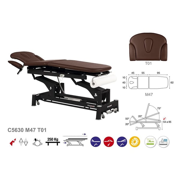 Neue und vielseitige multifunktionale Ecopostural-Elektrotrage mit drei Körpern, perfekt für jede Art von Behandlung. Es besteht aus einem elektrischen Hebesystem und einer Stahlkonstruktion aus Pleuelstangen mit Lagern und einziehbaren Rädern, die seine seitliche Bewegung erleichtern. Für mehr Komfort verfügt es außerdem über einen oszillierenden Kopf und eine Gesichtskappe. Es verfügt außerdem über eine Schaumstoffpolsterung in verschiedenen Stärken und eine Polsterung der Klasse M2.
