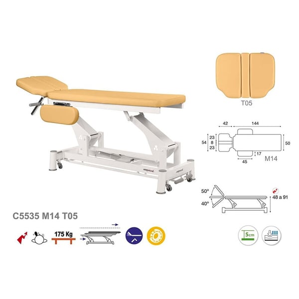 Elektrische Trage mit zwei Säulen, zwei Körpern und vertikaler Hebung mit klappbaren Armen und Kopfneigung bis zu 40° negativ und 50° Standard. Es hat ein einfaches, modernes und funktionales Design. Ein weiterer großer Vorteil des Tisches ist seine Vielseitigkeit, da er sich ideal für zahlreiche Bereiche eignet: Physiotherapie, Osteopathie, Allgemeinmedizin, Ästhetik, Tätowierungen. Eine perfekte Lösung für jeden Gesundheits- und Ästhetikprofi.