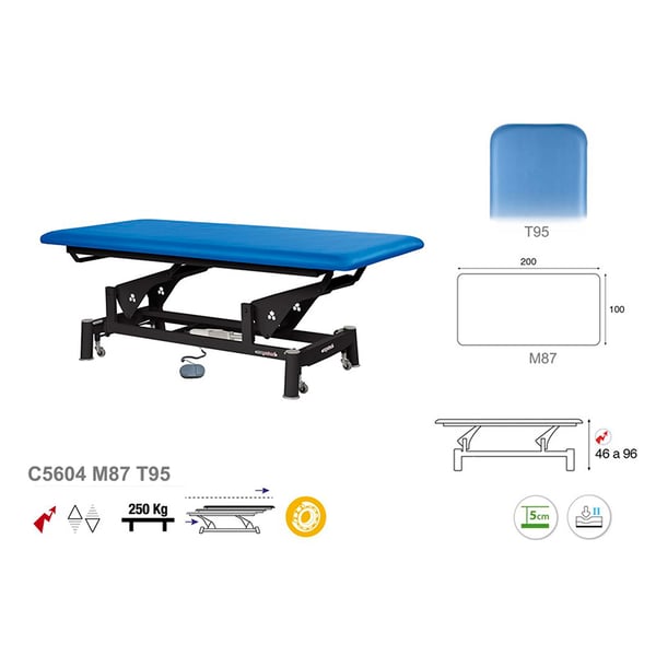 Innovative Ecopostural-Elektrotrage mit einem Körper, Bobath-Typ, ideal für Spezialitäten . Sie besteht aus einer Stahlkonstruktion mit einziehbaren Rädern und einem elektrischen Hebesystem , die das Bewegen der Trage erleichtern . Darüber hinaus verfügt es über eine Schaumstofffüllung unterschiedlicher Stärke und eine Polsterung der Klasse M2.