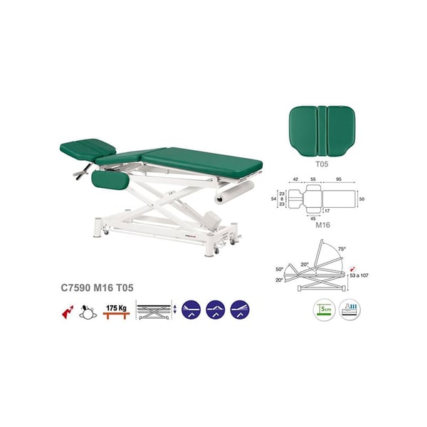 Neue und vielseitige multifunktionale Ecopostural-Elektrotrage mit drei Körpern, perfekt für jede Art von Behandlung. Es besteht aus einem elektrischen Hebesystem und einer weißen Scherenstruktur aus Stahl sowie einziehbaren Rädern, die seine seitliche Bewegung erleichtern. Ebenso verfügt es über einen oszillierenden Kopf für mehr Komfort. Es verfügt außerdem über eine Schaumstoffpolsterung in verschiedenen Stärken und eine Polsterung der Klasse M2.