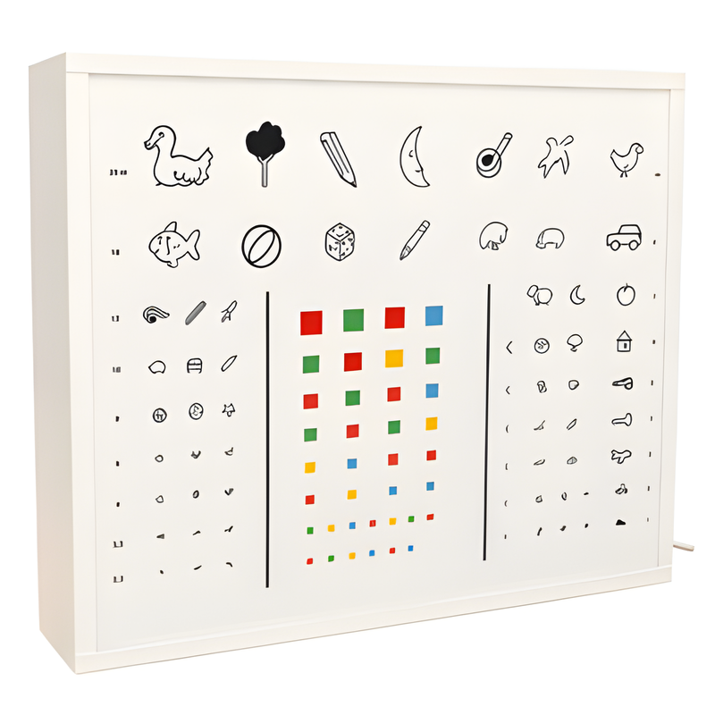Hergestellt aus emailliertem Stahlblech, bietet es Stabilität und einfache Wartung im Gesundheitswesen. Es verfügt über eine Leuchtstoffröhre und einen Methacrylat-Bildschirm mit kindgerechtem Siebdruck , der speziell entwickelt wurde, um Kindern das Erkennen von Figuren bei der visuellen Erkundung zu erleichtern.