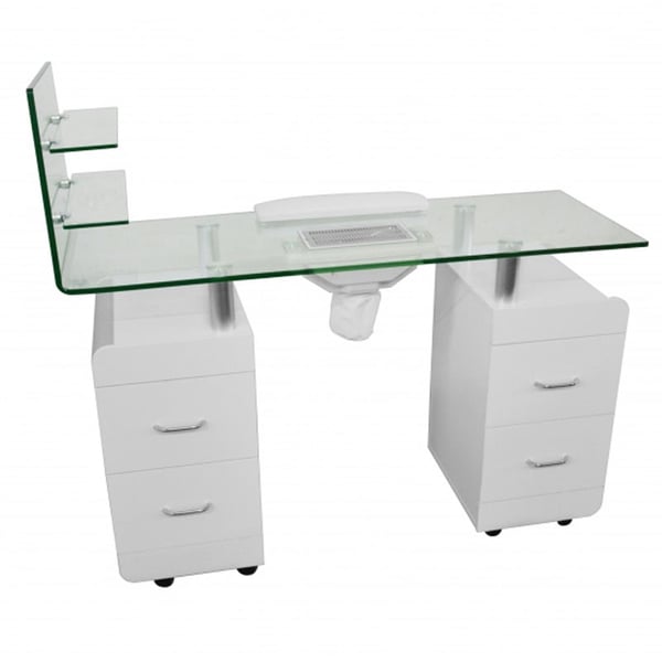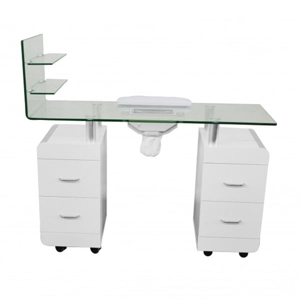 Eleganter Manikürtisch aus weißem Sperrholz mit Staubsauger, Tasche und Handballenauflage. Platte und Regale aus gehärtetem Glas . Ausgestattet mit einer Doppelsäule mit Schubladen und Rädern inklusive . Es enthält praktische Funktionen wie Staubsauger, Beutel und Handauflagekissen.