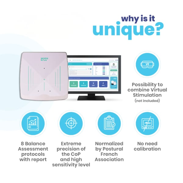 Das System analysiert präzise den Druckpunkt (CoP), die statische und dynamische Stabilität sowie die Körperschwingungsmuster und ist somit ein wichtiges Instrument in der vestibulären und neurologischen Rehabilitation und Sturzprävention.
