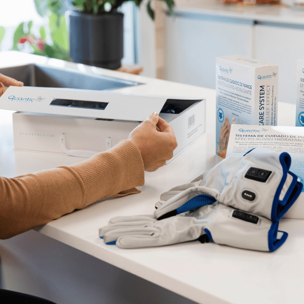 Die elektronischen Handschuhe von QUANTIC NANOTECH® nutzen verschiedene physikalische Behandlungsmethoden, deren Wirksamkeit bei Handsteifheit wissenschaftlich belegt ist. Dieses innovative Konzept vereint die Vorteile von Wärme und Vibration in einem einzigen Gerät und ermöglicht Ihnen zwei 20-minütige Anwendungen pro Tag per Knopfdruck.