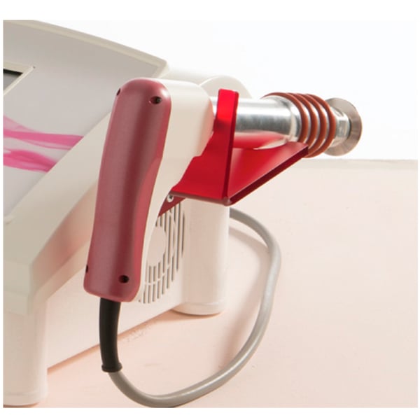 Die akustische Welle durch das Handstück in der Form einer Waffe erzeugt wird, deren Lauf durch eine Metallkappe am Ende geschlossen ist, gegen die mittels Druckluft aufgeschmolzen wird, Stahl Geschosses erzeugen somit eine Welle acoustic ausbreitende vom Berührungspunkt mit der Haut zu den Schichten in mehr Tiefe.