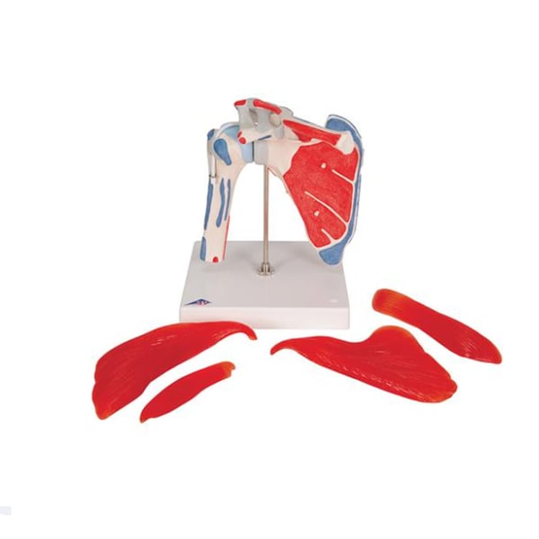 Neben der Darstellung der Rotatorenmanschettenmuskulatur sind die Ursprungs- und Ansatzflächen der Schultermuskulatur farblich hervorgehoben (Ursprung = rot; Ansatz = blau). Folgende Muskeln sind dargestellt und können abgenommen werden: Subscapularis, Supraspinatus, Infraspinatus, Teres Minor.
